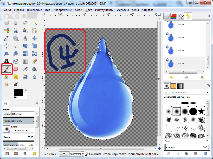 Для рисования с помощью инструмента «Кисть» необходимо нажать левую кнопку мыши и провести курсором по изображению. Цвет и текстура, которые будут применяться при рисовании, зависят от выбранных настроек.