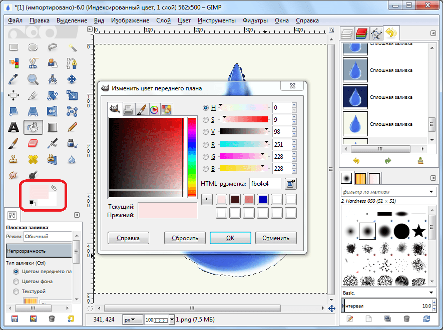 Выбор цвета для использования инструментами производится путем нажатия на соответствующую кнопку в левой панели. После этого появляется окно, где при помощи палитры можно выбрать требуемый цвет.