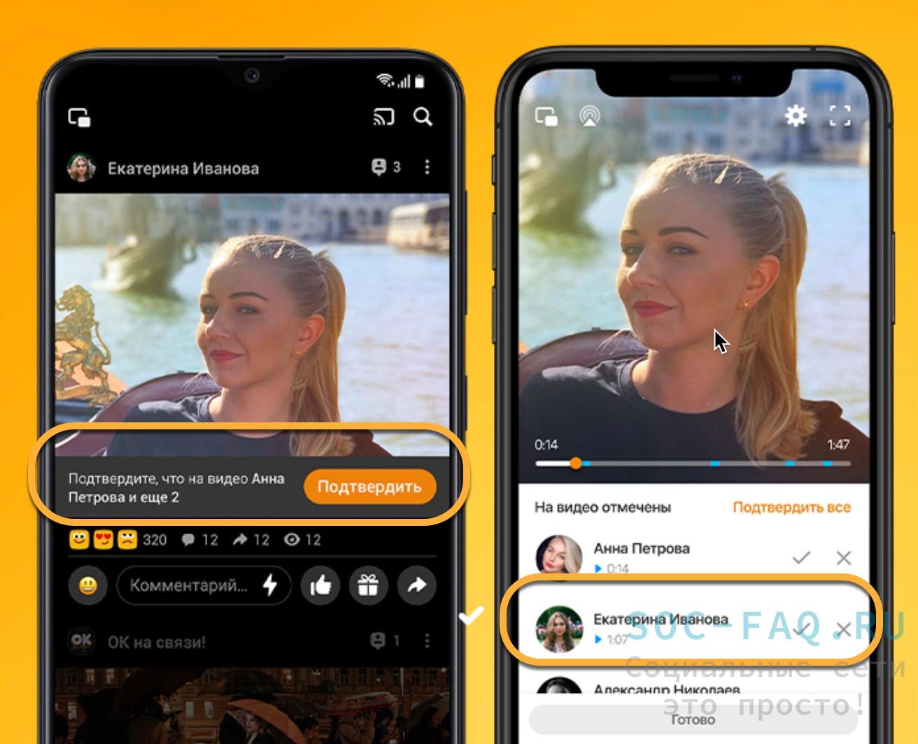 Раньше приложения ОК не позволяла отметить человека на фото, но со временем она стала доступна. Алгоритм действий с мобильной версии абсолютно тот же, разве что прямоугольник для отметки появляется автоматически — его необходимо передвинуть на требуемое место.