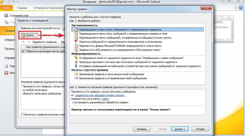 В этом окне нажимаем на кнопку «Новое». После чего откроется «Мастер правил». В нем мы находим раздел «Начать с пустого сообщения«, и выбираем «Применение правила к полученным мной сообщениям» и жмем кнопку «Далее».