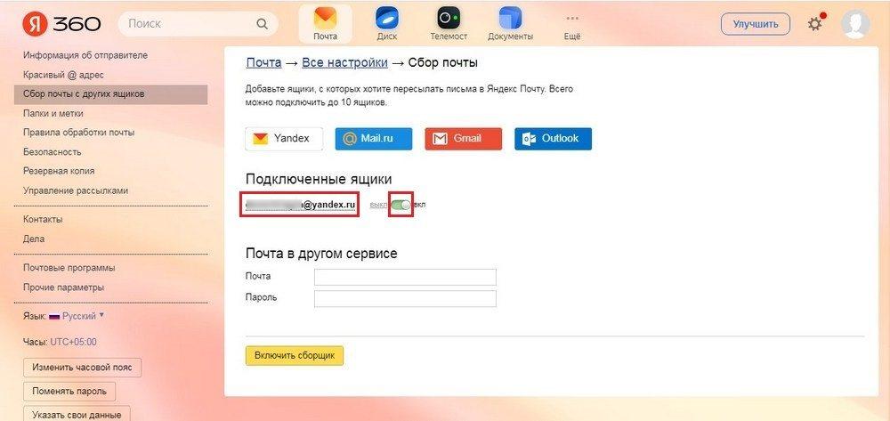 После перенаправления на страницу сборщика почты можно увидеть, что новый адрес для сбора почты включен, т.к.ползунок около него находится в положении «Вкл».