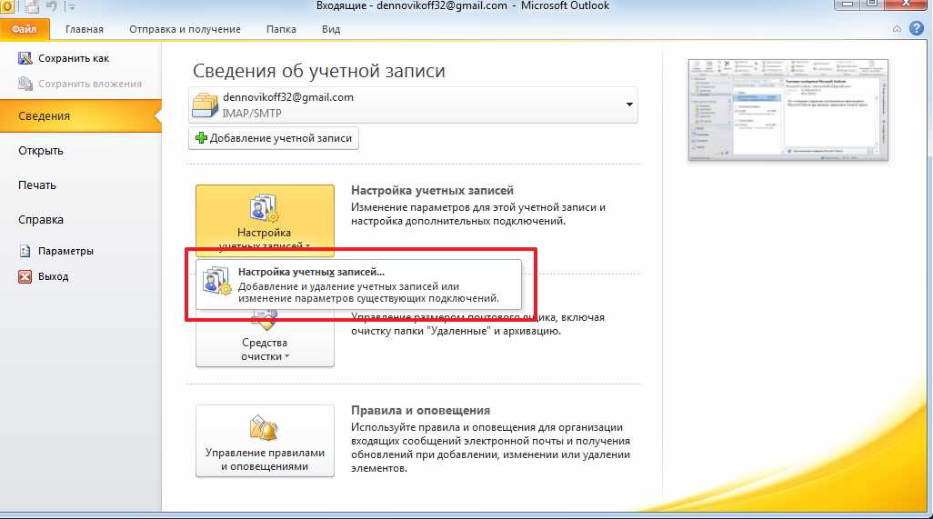 Итак, зайдем в меню «Файл» и кликнем по кнопке «Настройка учетных записей». В списке выберем одноименный пункт.