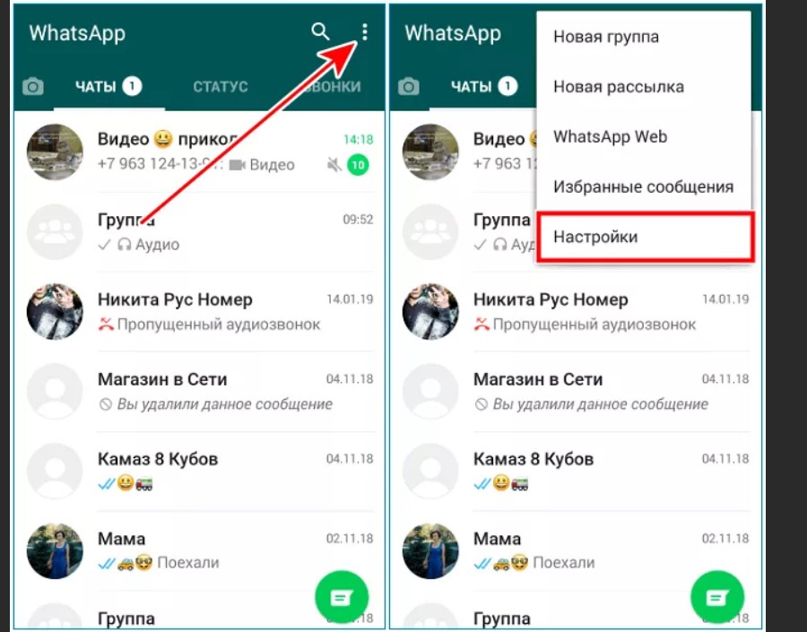 Чтобы перейти в настройки мессенджера, нажмите на три «точки» вверху экрана