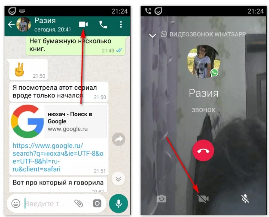 Звонки и видеовызовы в WatsApp обозначаются значками