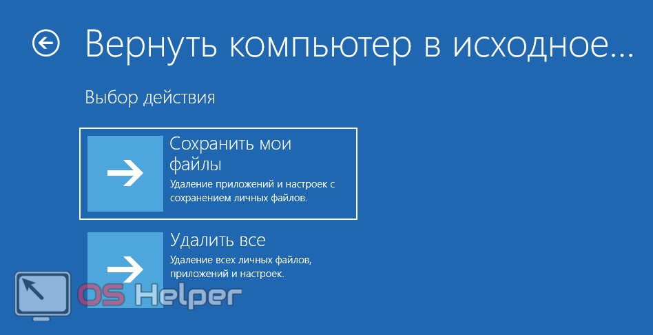 - Сохранить мои файлы — удаление приложений и настроек с сохранением личных данных.