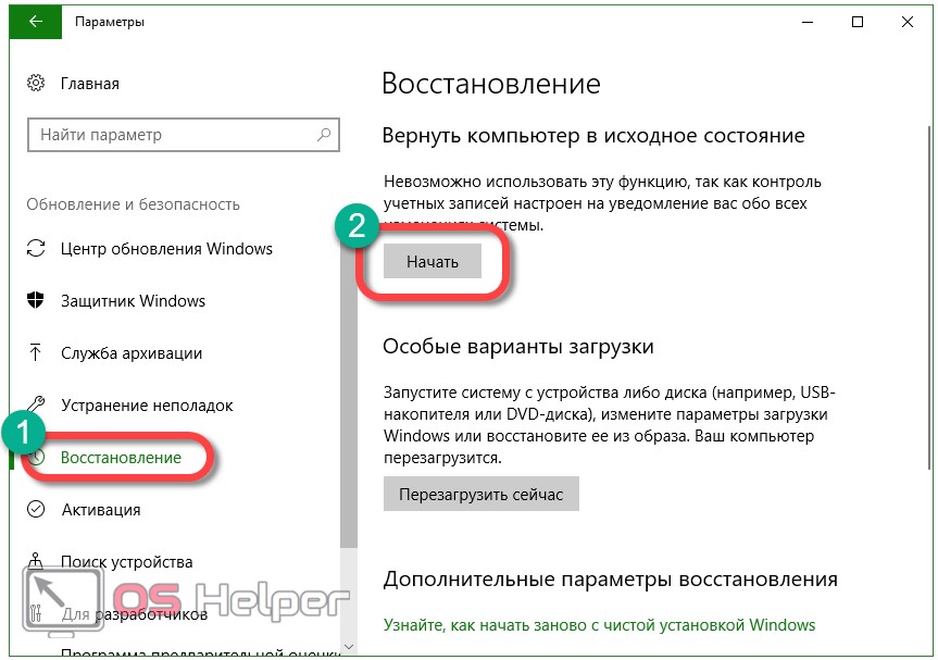 В windows 8 и 10 запустить восстановление исходного состояния можно, перейдя в раздел «Параметры» → «Обновление и безопасность» → «Вернуть компьютер в исходное состояние» → «Начать».