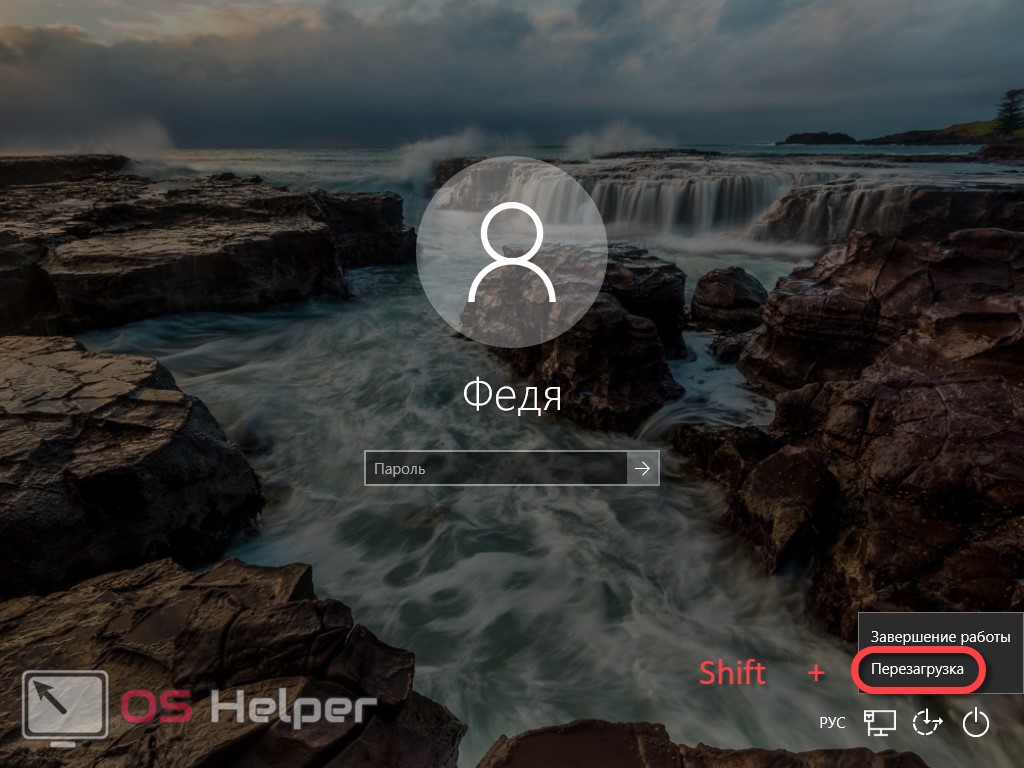 Попасть в данный режим можно даже без входа в систему. Для этого на экране входа в Windows зажимаем кнопку Shift и перезагружаем ПК.