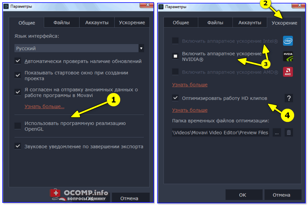 Аппаратное ускорение NVIDIA, AMD, Intel. Использовать программную реализацию OpenGL / Movavi видеоредактор