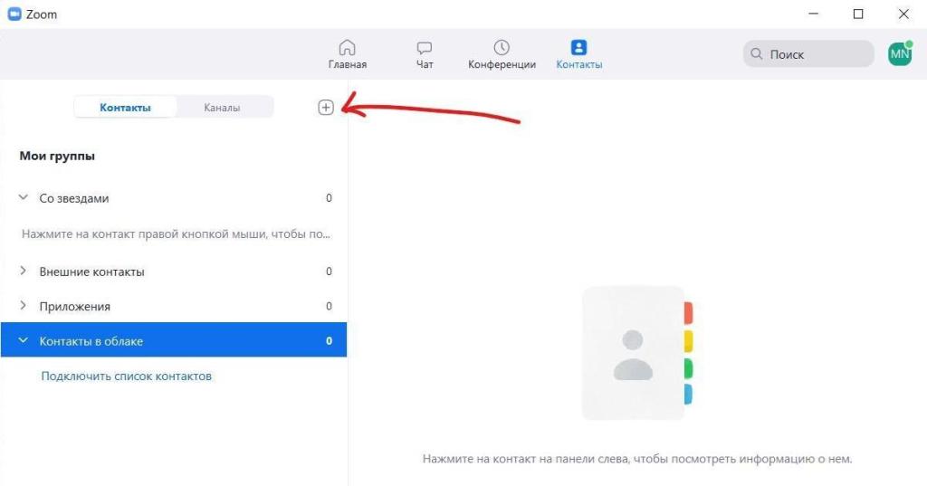 - Контакты. Этот параметр находится в верхней части экрана. Здесь можно добавлять новых людей, группировать их в зависимости от методов и периодов контактов. Для каждого из них вводят параметры электронной почты, создавая адресную книгу. Запрос на проведение конференции будет передаваться в самом Зуме и по почте.