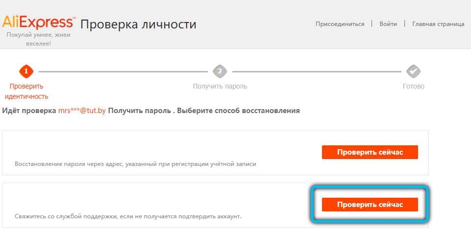 5. Затем система выполнит проверку вашей почты в своей базе аккаунтов и выдаст два варианта дальнейшего развития событий – это отправка уникального кода на электронный адрес или обращение в службу поддержки. Рассмотрим пока первый вариант. Нажимаем кнопку «Проверить сейчас».