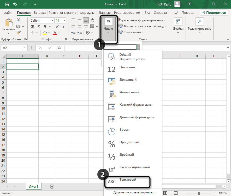 Активируйте курсор на строке для ввода числа и на главной вкладке разверните список «Число», из которого выберите пункт «Текстовый».