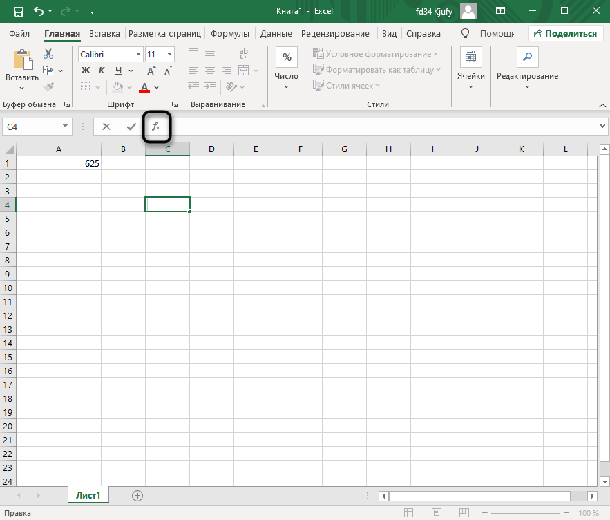 Активируйте ячейку для расположения функции, кликнув по ней левой кнопкой мыши. Затем нажмите по значку fx для открытия соответствующего окна.