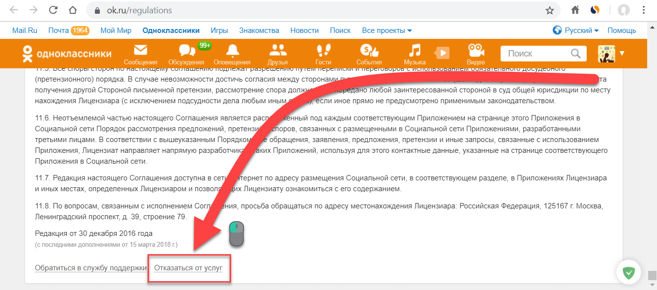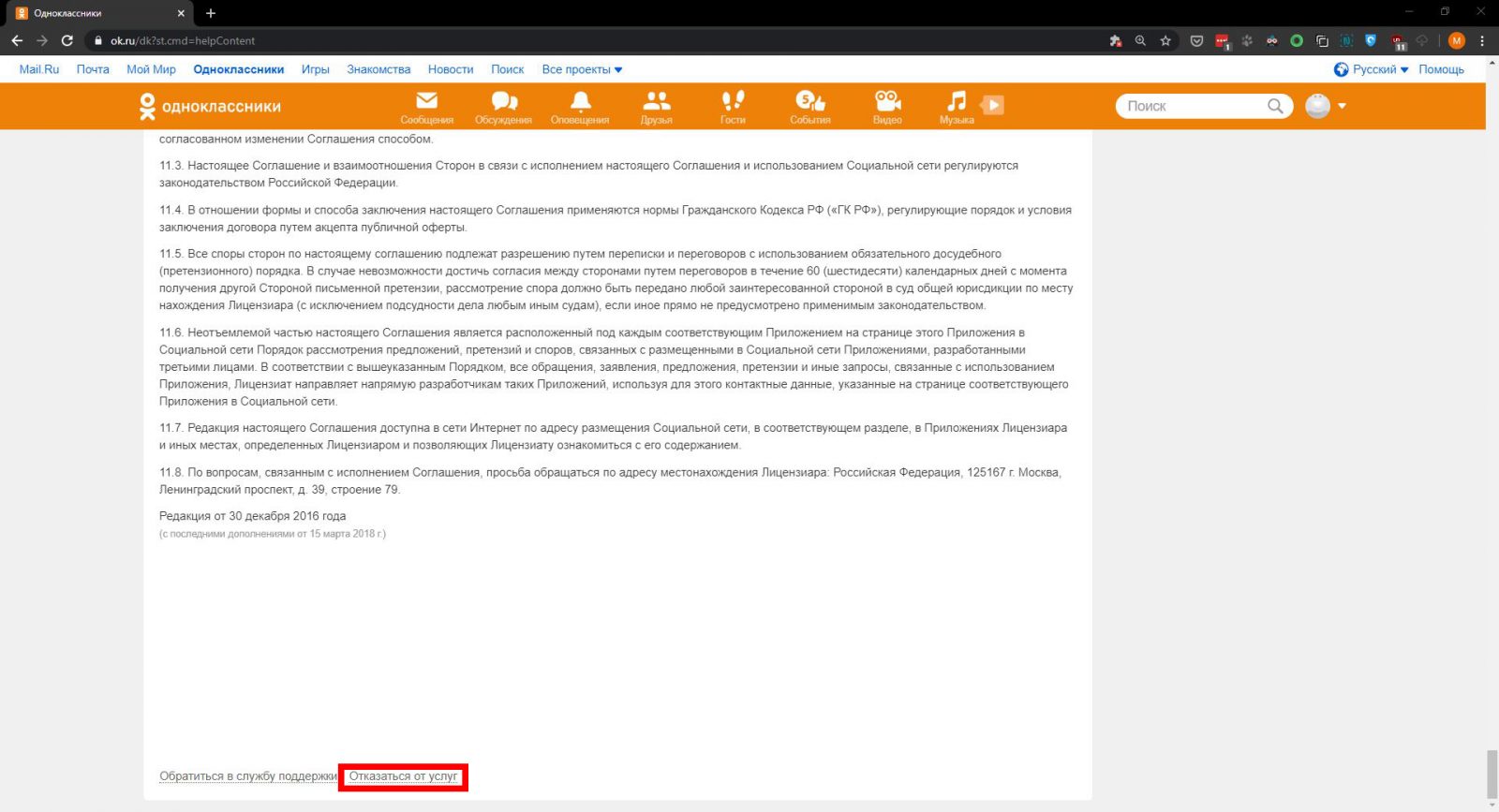 2. Снова воспользовавшись скроллированием (полосой прокрутки), под длинным сводом правил найдите ссылку «Отказаться от услуг» и перейдите по ней (на ПК: наведите курсор и нажмите левую кнопку мышки).