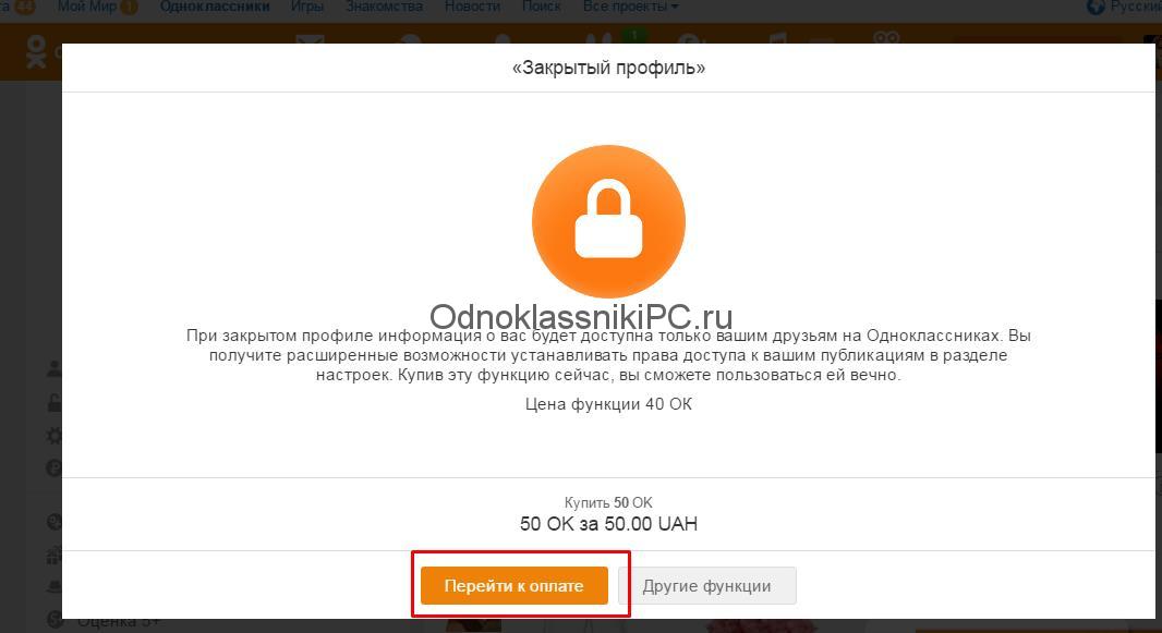 Если Вы не хотите, чтобы кто-либо, кроме друзей, мог просматривать Вашу страницу в Одноклассниках, профиль можно закрыть. Но эта функция платная, сейчас она стоит 50 Ок на постоянной основе. Если оплачивать Оки с банковской карты, то это получится 50 рублей, если через телефон, то 85 рублей.