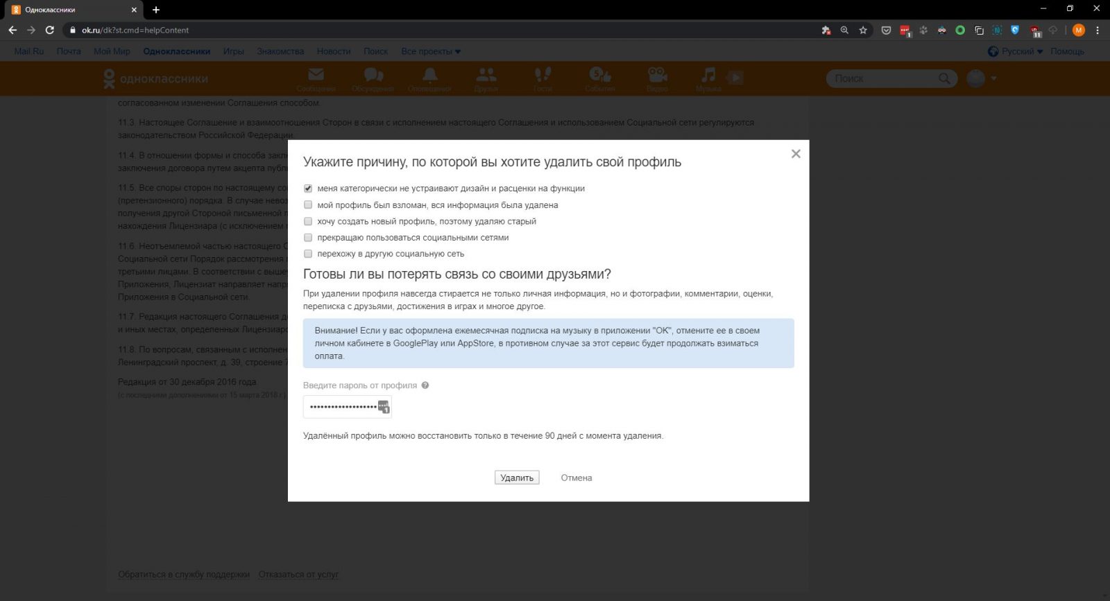 Вам остаётся только выбрать причину из того перечня, что предлагается в форме, а так же ввести пароль. Только в таком случае у вас получится навсегда избавиться от индивидуального профиля в ОК. Сразу стоит пояснить, что вам разрешается выбрать абсолютно любую причину, так как от этого ничего не зависит.