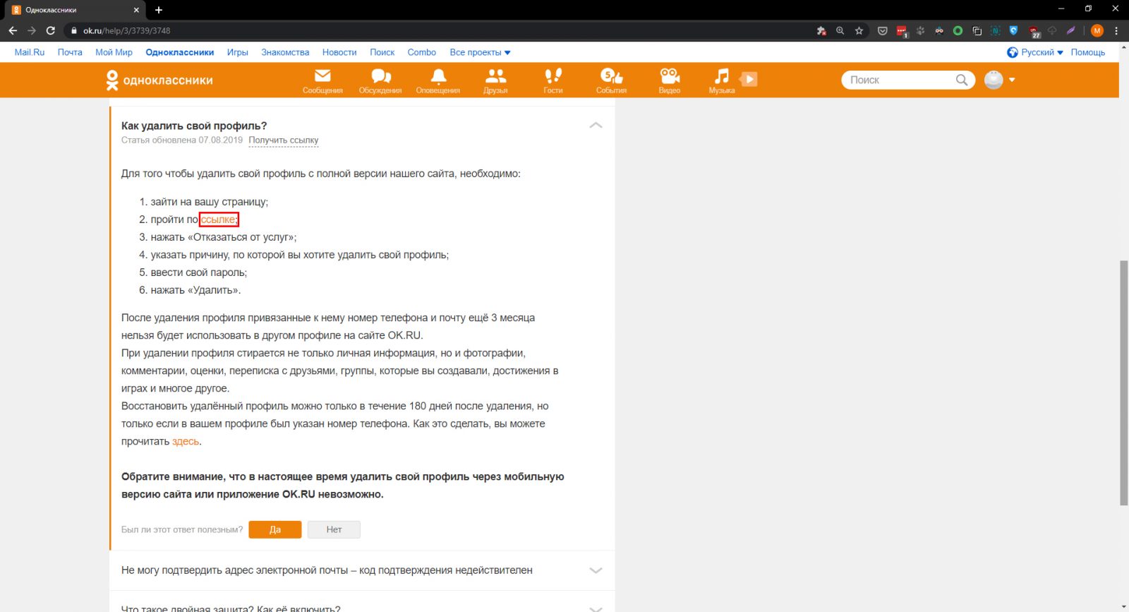 Если не получилось раскрыть пункт «Еще, тогда через браузер мобильника следует авторизоваться в социальной сети и перейти по адресу – https://ok.ru/dk?st.cmd=helpContent, следовать инструкции с 6 по 10 шаг.