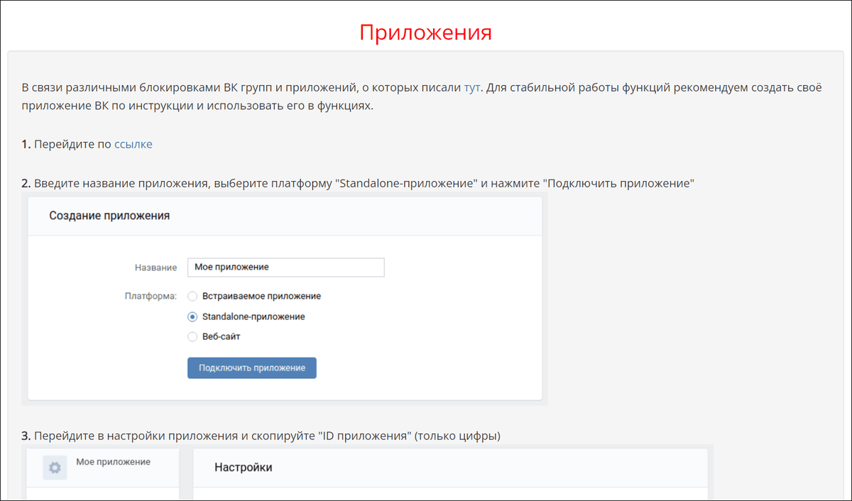 Дополнительно, для более стабильной работы, этот сервис предоставляет возможность создать свое приложение в ВК и подключаться от его имени.