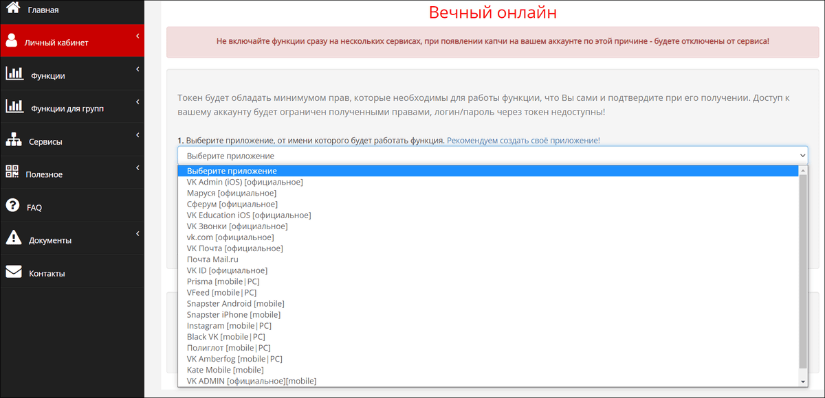 Этот способ установки постоянного онлайн подразумевает регистрацию на ресурсе, выбор приложения от имени которого предоставляется вечный доступ, получение токена ВК (ключ доступа к аккаунту в виде ссылки) и активацию услуги.