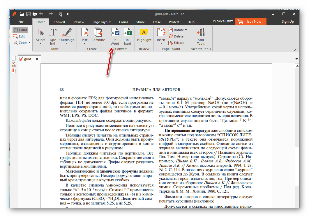 - Открываем файл с расширением PDF в конверторе Nitro Pro и нажимаем на кнопку в панели инструментов «To Word»
