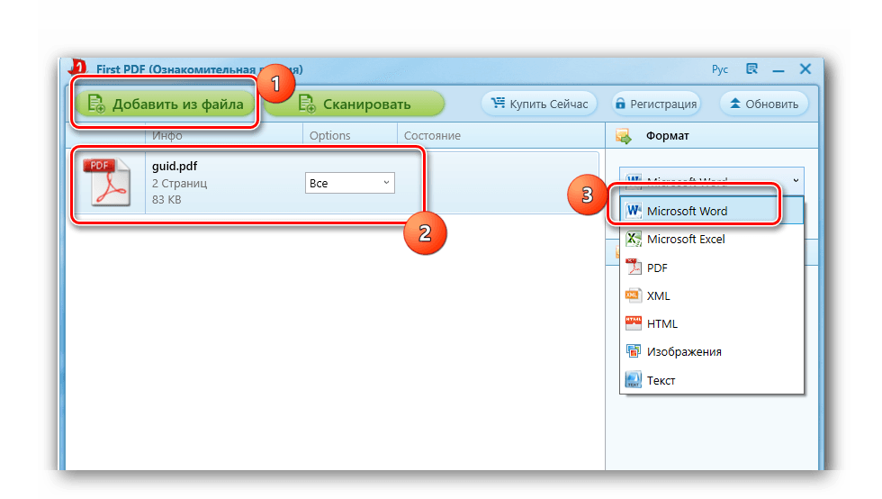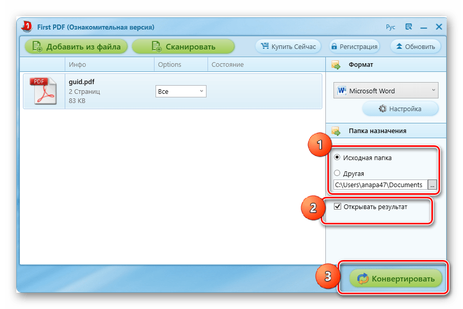 Ознакомительная версия конвертера First PDF обеспечивает конвертацию файлов на протяжении 30 дней или до 100 конвертаций. Программа русифицирована.
