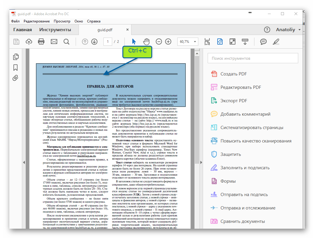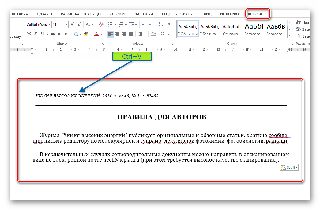 - В данном случае достаточно выделить нужный текст в Adobe Acrobat, скопировать его, используя комбинацию клавиш «Ctrl+C»