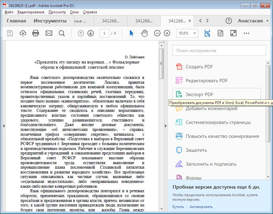 - Итак, открываем в программе Adobe Acrobat DC файл с расширением ПДФ, который нужно перевести в Вордовский файл.