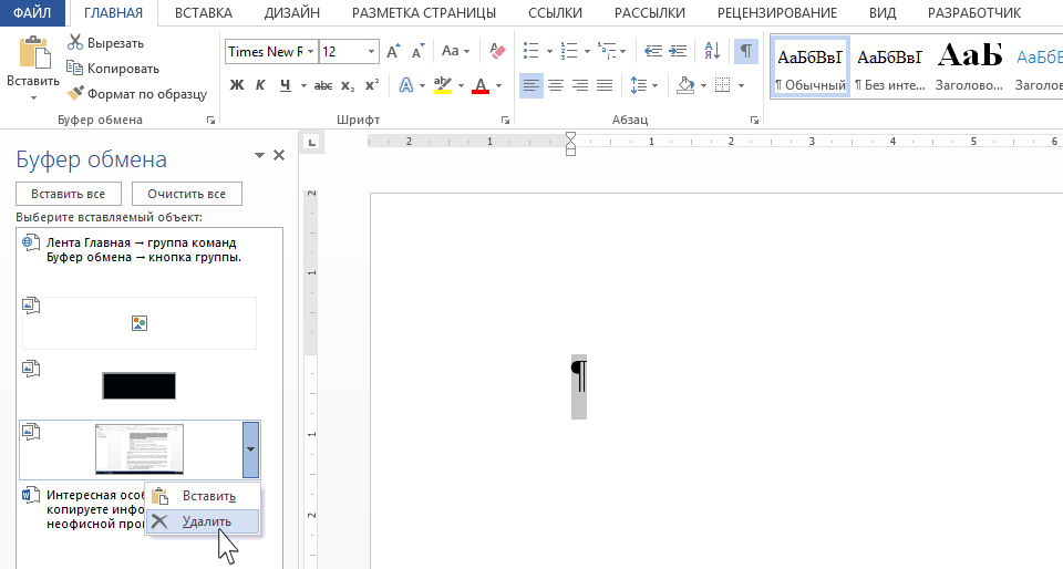 Обратите внимание: на выбранном вами фрагменте появляется кнопка выпадающего меню. Щёлкните ЛМ по кнопке выпадающего меню и вы увидите две команды на выбор: Вставить и Удалить. Командой Удалить вы удаляете этот фрагмент из буфера обмена: