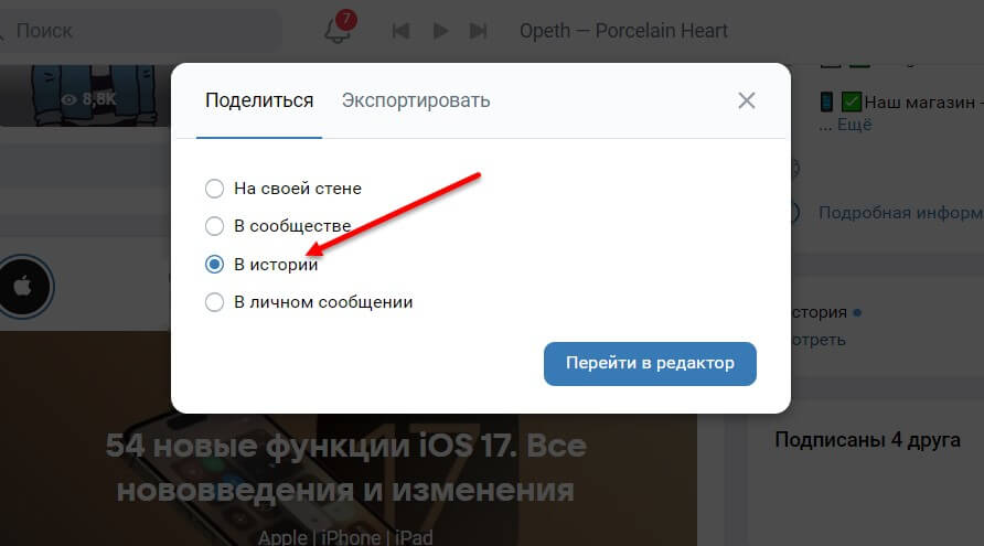 Вызвав контекстное меню, в появившемся списке необходимо выбрать пункт «В истории», а после – перейти в специальный редактор для подготовки контента к публикации.