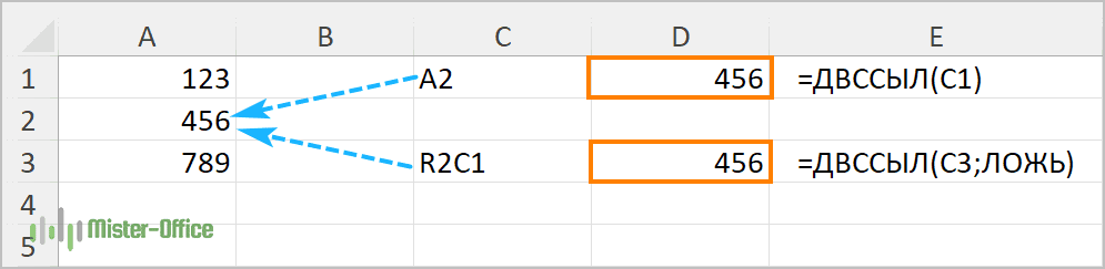 А теперь давайте сравним на простом примере, как функция ДВССЫЛ обрабатывает адреса вида A1 и R1C1:
