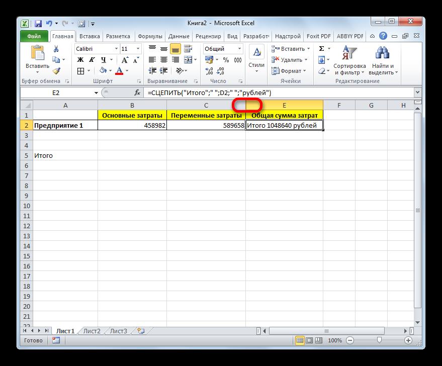 Аналогичное простое решение, но с теми же недостатками — использование функции СЦЕПИТЬ. Применяется она так: =СЦЕПИТЬ(«Итого: «;A1). Результаты ее использования аналогичные: