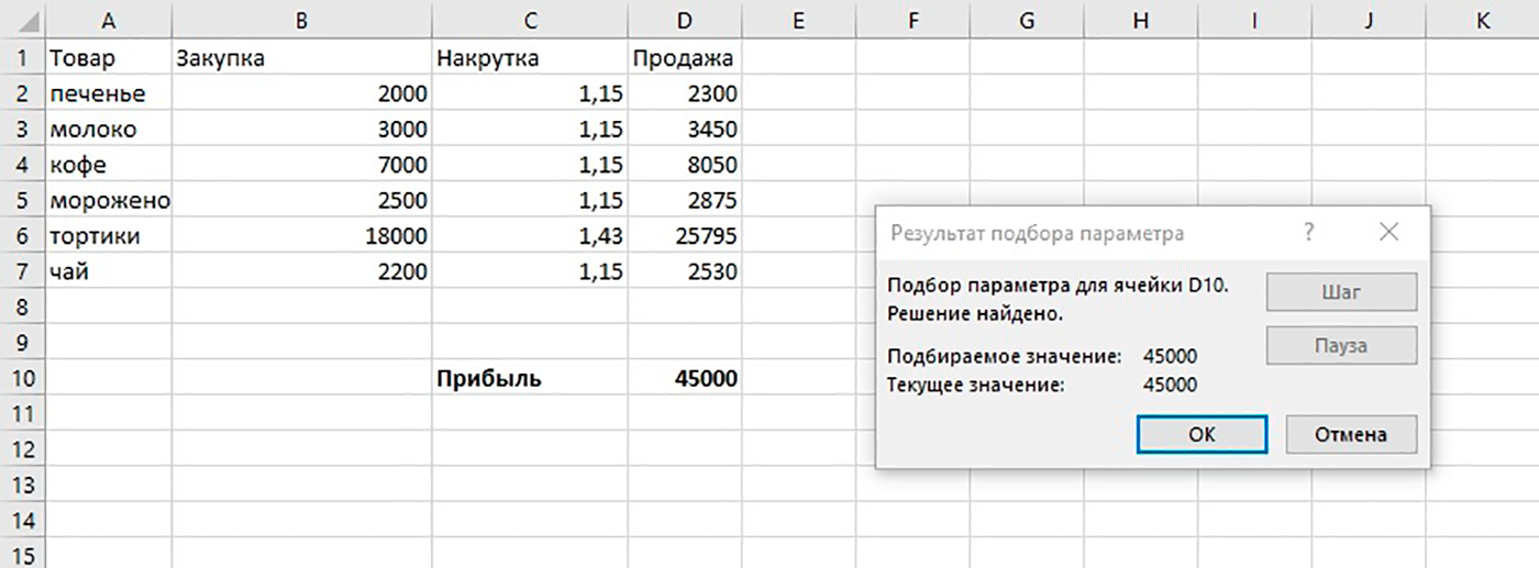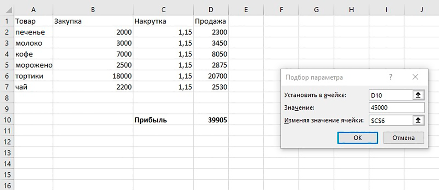 «Подбор параметра» подойдет и для составления бизнес-плана. Введите желаемую прибыль и посчитайте, сколько единиц товара и с какой накруткой нужно продавать