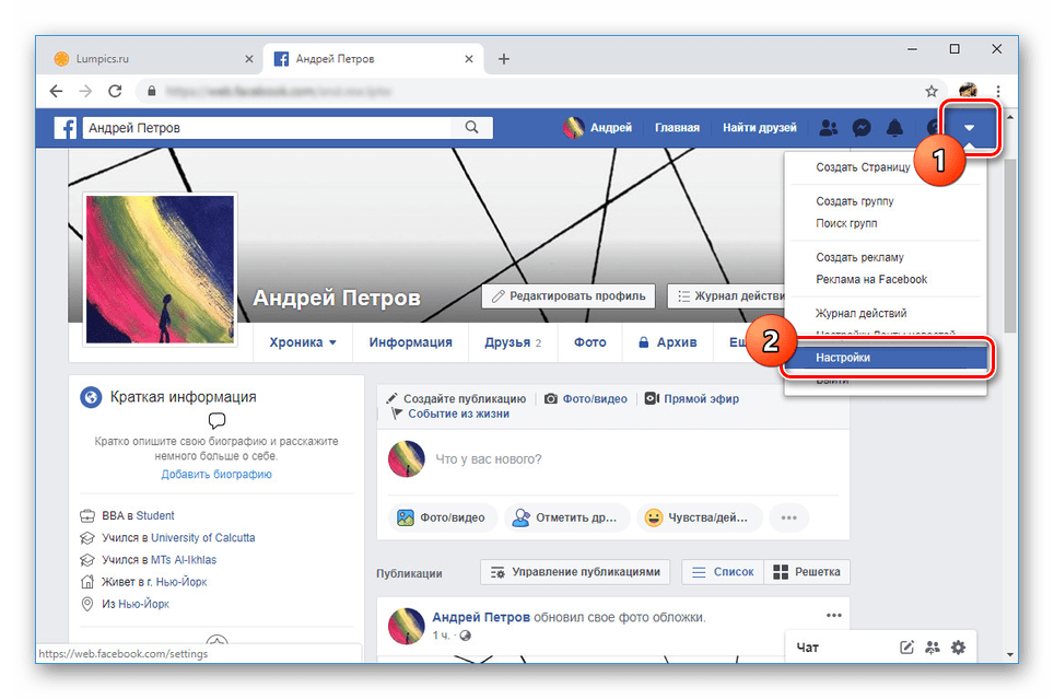 2. В появившемся списке параметров выберите «Настройки», чтобы открыть страницу настроек Facebook.