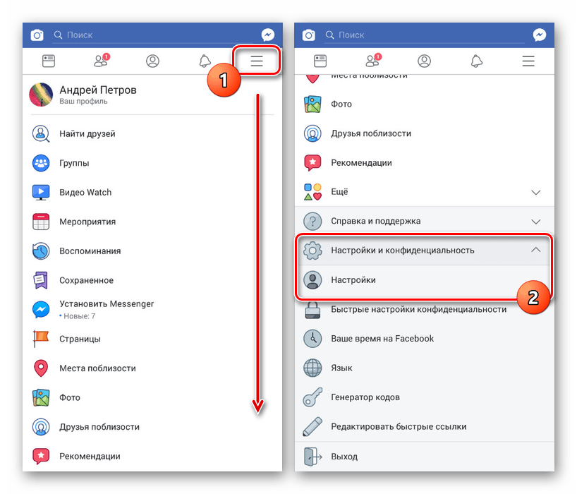 - Тапните по значку главного меню в крайнем верхнем углу экрана и найдите на странице раздел «Настройки и конфиденциальность». Развернув его, выберите пункт «Настройки».