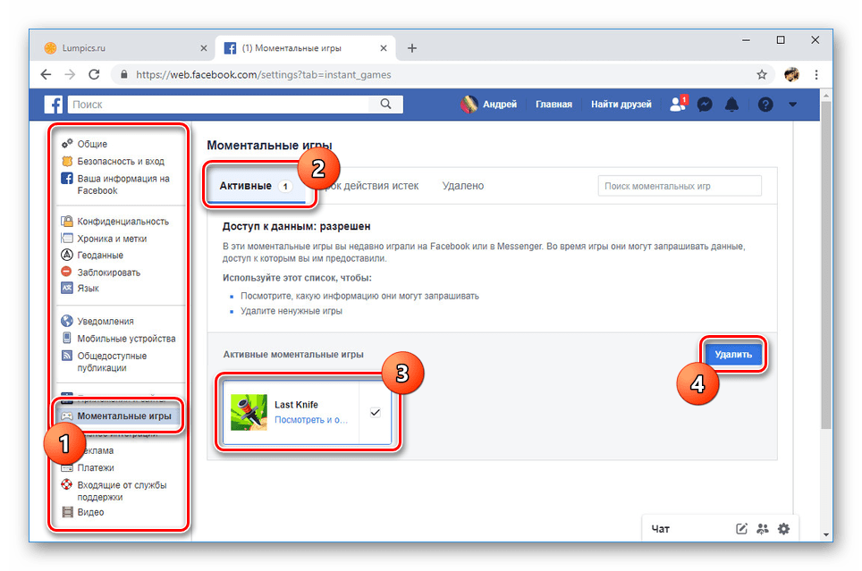 По аналогии с веб-сайтом, вы можете вернуться в основной раздел с «Настройками» Facebook и выбрать пункт «Моментальные игры» в блоке «Безопасность».