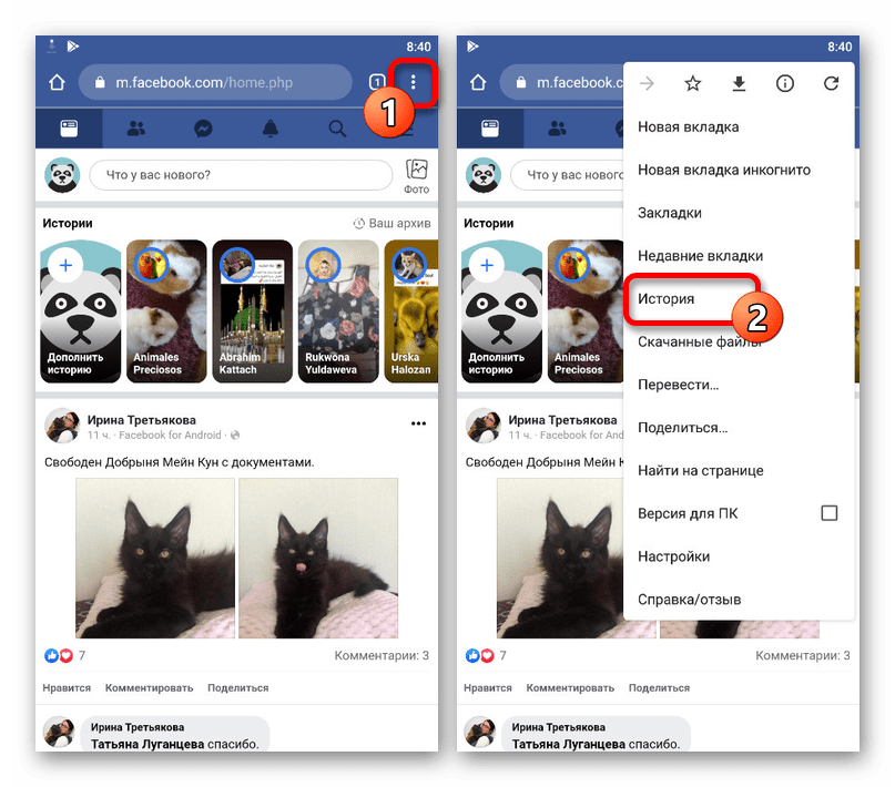 - Откройте веб-обозреватель, который использовался для посещений FB, и нажмите по значку с тремя вертикальными точками в правом верхнем углу экрана. Через представленное меню нужно перейти в раздел «История».