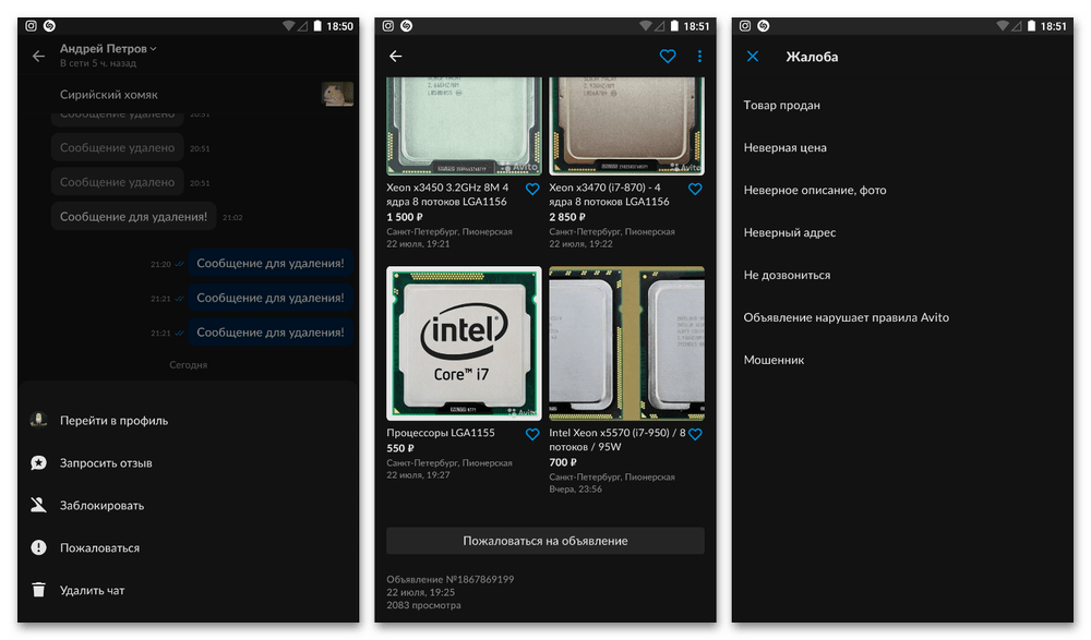 Если вас интересует полная блокировка определенного пользователя на Авито, создать жалобу можно на выбор через упомянутое ранее меню в личных сообщениях торговой площадки или воспользовавшись отдельной кнопкой на странице объявления. Какой бы из вариантов не был выбран, необходимо указать нарушение пользователя из соответствующего списка и отправить уточняющее сообщение в адрес поддержки.