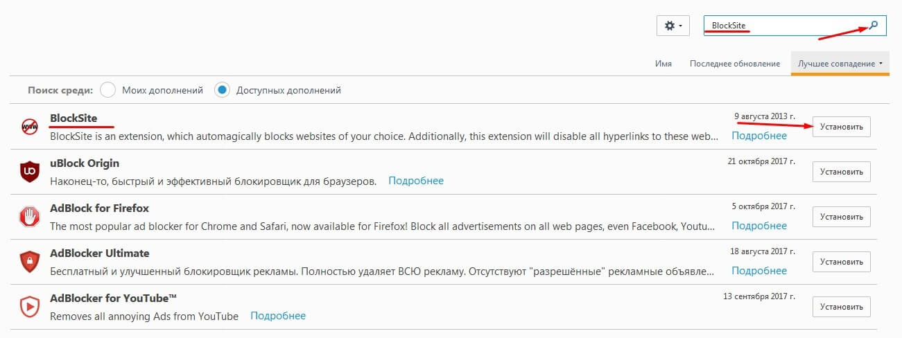 Затем в поисковой строчке прописываем название расширения «BlockSite», без кавычек. Нажимаем на значок в виде лупы, расположенный справа от окошка поиска. Выбираем искомый плагин и справа от него, жмём на кнопочку «Установить».