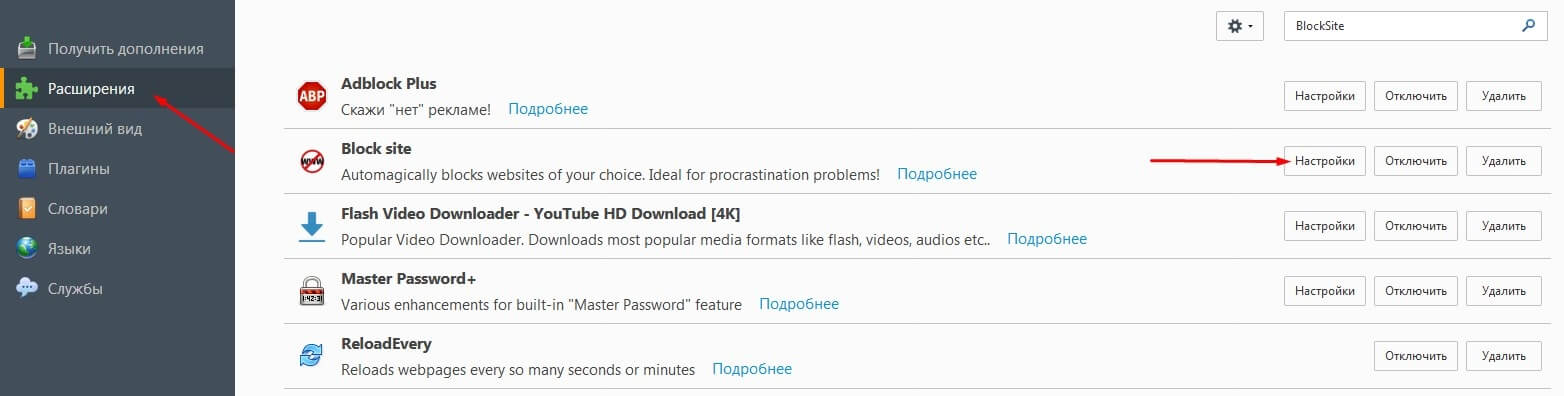 В левой части окошка кликаете на пункт «Расширения» и в списке плагинов выбираете «BlockSite». Справа от него жмёте кнопочку «Настройки».