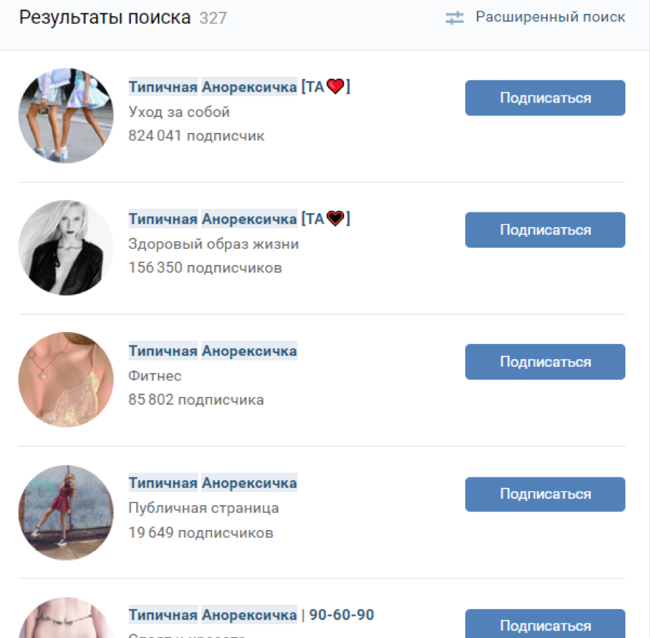 В социальной сети ВКонтакте можно наткнуться на большое количество пабликов, которые формируют у девочек представление об «идеальной внешности». У ребенка падает самооценка, он начинает видеть в себе несуществующие косметические дефекты и искать способы их исправления. Некоторые садятся на опасные диеты, которые могут подорвать здоровье. Нередки случаи, когда подростки начинают страдать от булимии, анорексии и дистрофии именно из-за диет и стрессов.