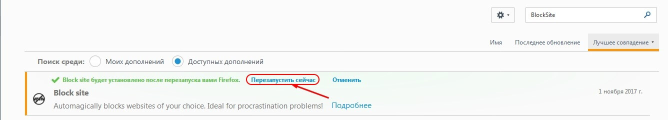 Для того чтобы настройки дополнения вступили в силу, нажмите кнопочку «Перезапустить сейчас» или просто закройте веб-браузер, и при следующем вашем запуске интернет – обозревателя Firefox приложение будет активировано.