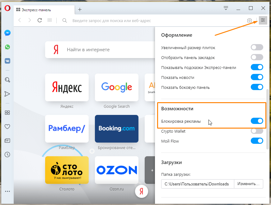 В настройках самого браузера Opera мы можем заблокировать рекламу следующим образом: