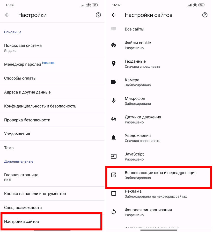 - «Настройка сайтов» – «Всплывающие окна и переадресация».