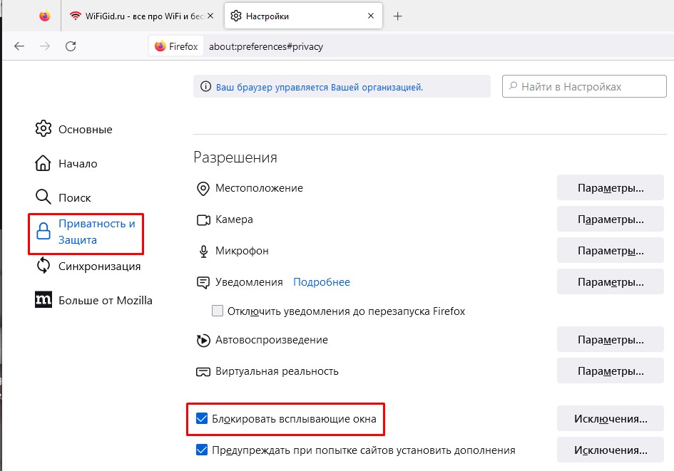 - Слева нажмите по значку замочка или зайдите в раздел «Приватность и защита». В подразделе «Разрешения» уберите или установите галочку, чтобы «Блокировать всплывающие окна». Вы можете также назначить исключения, нажав по кнопке справа – вам будет достаточно ввести URL определенных сайтов или страниц, на которые эти правила распространяться не будут.