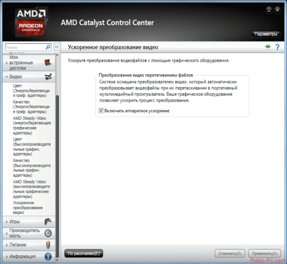 Следующим шагом настройки параметров просмотра видео и фото будет раздел «AMD Steady Video» в меню «Видео». Эта функция позволяет стабилизировать дрожащее видео при съемке которого происходило передвижение. Эта опция позволит уменьшить степень дрожания видео для комфортного просмотра, но и так же лишний раз нагрузить графический адаптер, поэтому советую деактивировать эту опцию, если ваша видеокарта маломощная.