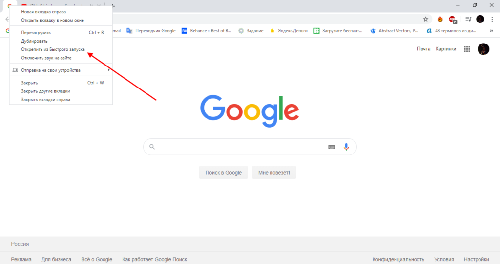 - Открываем в браузере вкладку, которую нужно закрепить и кликаем по ней правой кнопкой мыши.