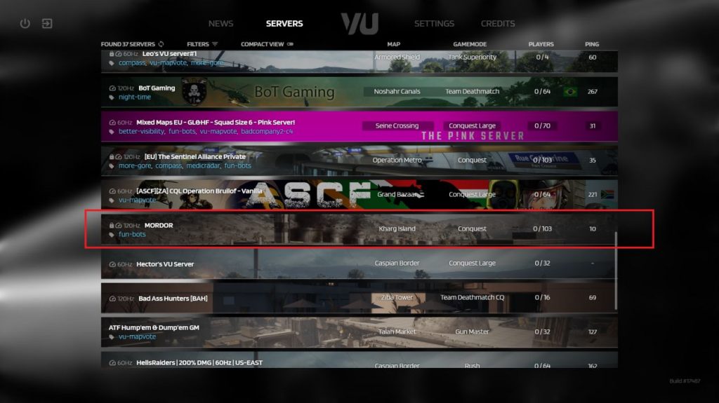 Now, launch your VU client, and navigate to the server browser. Look for your server. Remember that we called our server “MORDOR”. Here it is!