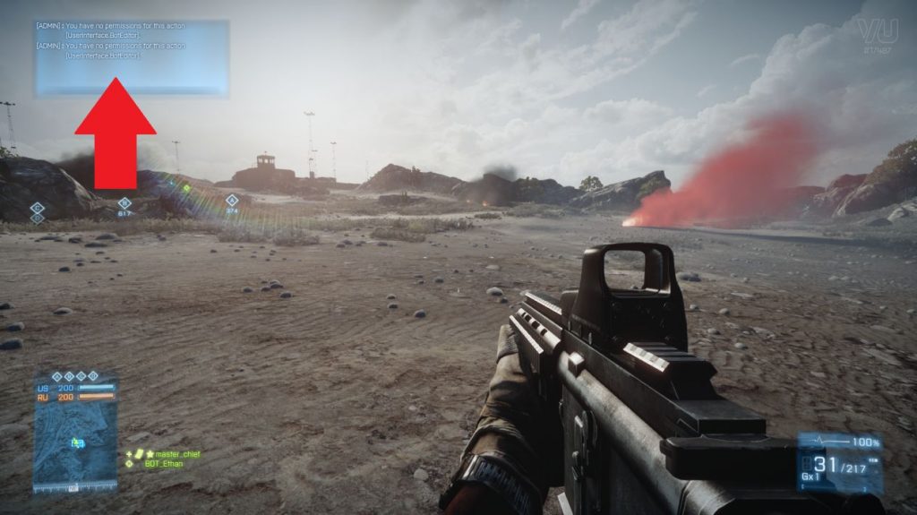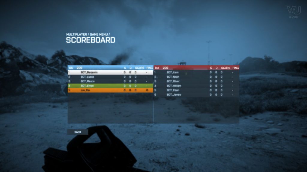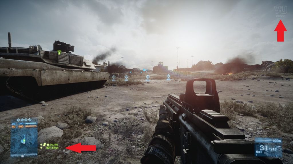 If you did everything correctly, and you successfully joined your server, you will notice the VU watermark in the top right corner. You will also notice that one of your squadmates is a bot. Congratulations! You now know how to play Battlefield 3 with bots. Unfortunately, there is still one problem…