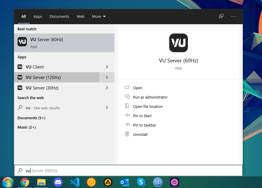 To start your VU Battlefield 3 server, simply press Start button, and type “VU”. Choose one of the shortcuts that will appear on the start menu. If you have a powerful PC, don’t hesitate to run a 120 Hz server.