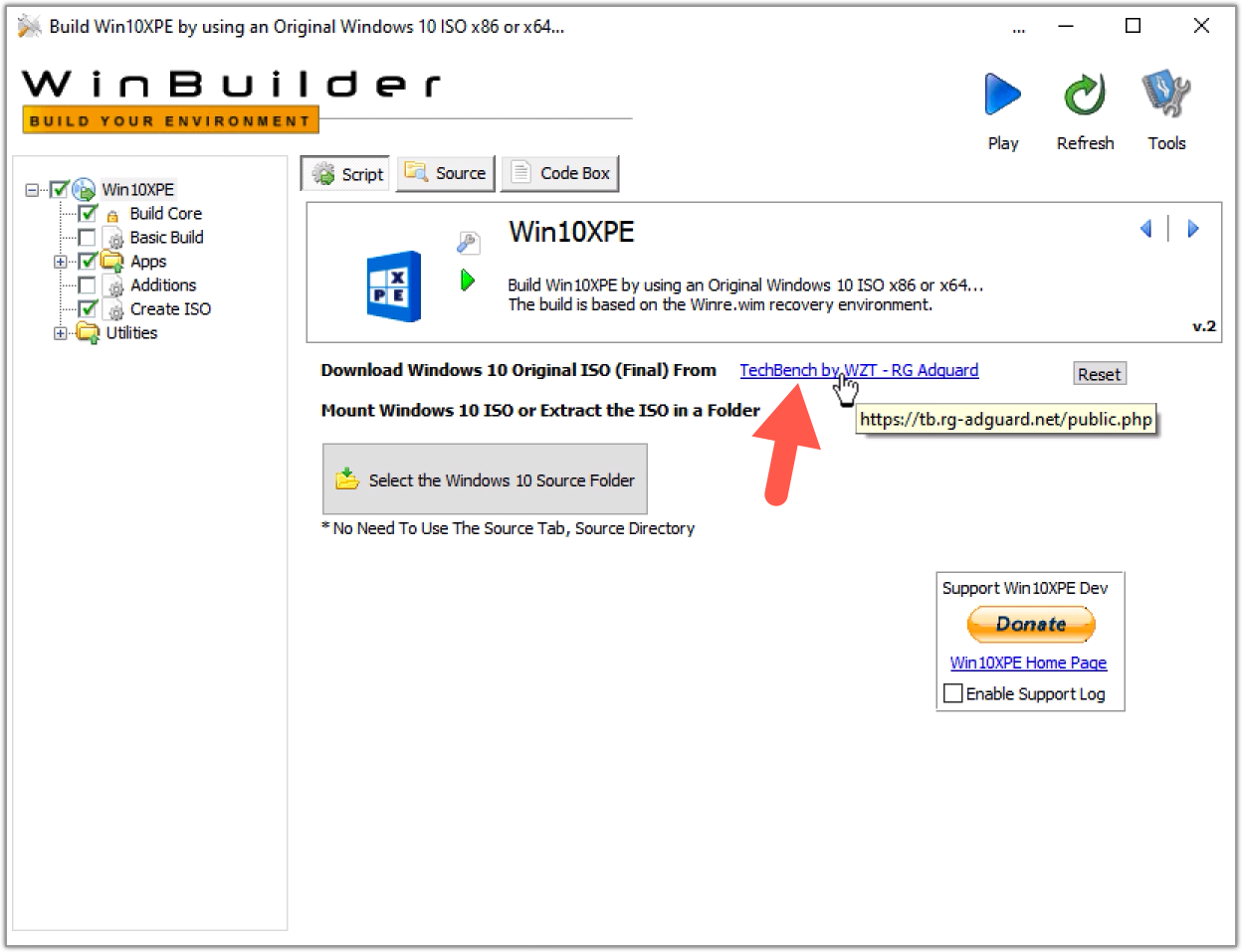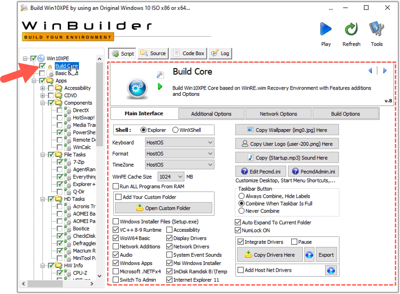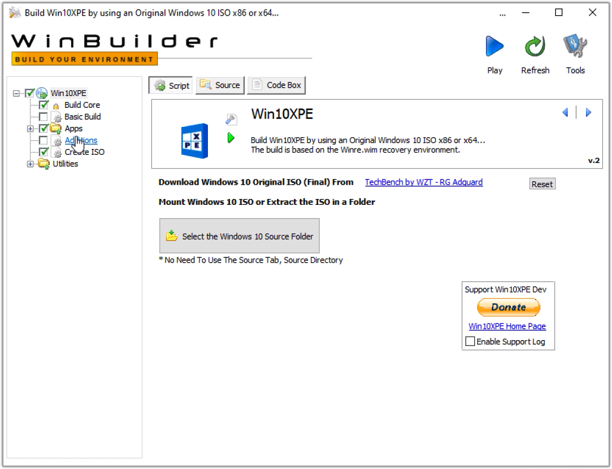 Второй инструмент, о котором пойдет речь, имеет гораздо более широкие возможности. Она называется Win10XPE и интерфейс нельзя назвать интуитивно понятным, так как он содержит большое количество различных настроек.