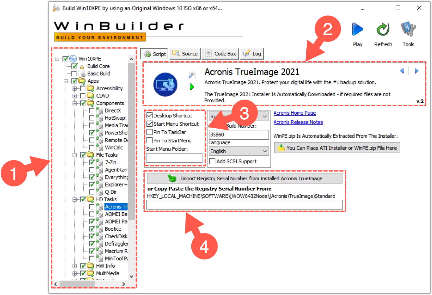 В список также входят платные инструменты, такие как AcronisTrueImage. Если у вас есть лицензия на такие инструменты, вы можете вставить ее в соответствующее поле (4), и тогда инструмент можно будет включить в сборку и использовать с флешки.